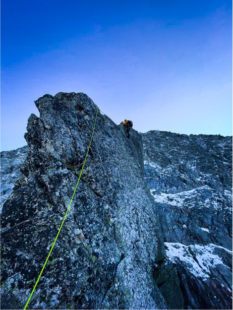 Ráno nás čeká vstávačka v 5 hodin a zahřívací hodinka na Skalnaté pleso, odkud pokračujeme dále do Huncovského sedla. Cestu nahoru nám stěžuje všudypřítomná námraza a každý krok si vyžaduje pozornost. Dostáváme se do sedla a čeká nás odměna ve formě naprosté inverze a krásného slunečného rána. Odtud pokračujeme přes malý Kežmarák na Kežmarský štít, kde si chystáme cajky. Vytahuji frendy a smyce z batohu a namotávám lano Alpine 7.9 mm, které jsme zvolili trochu kratší, než je ideální, ale 30 m namísto 50 m bude muset stačit. No co už, nějak si poradíme.